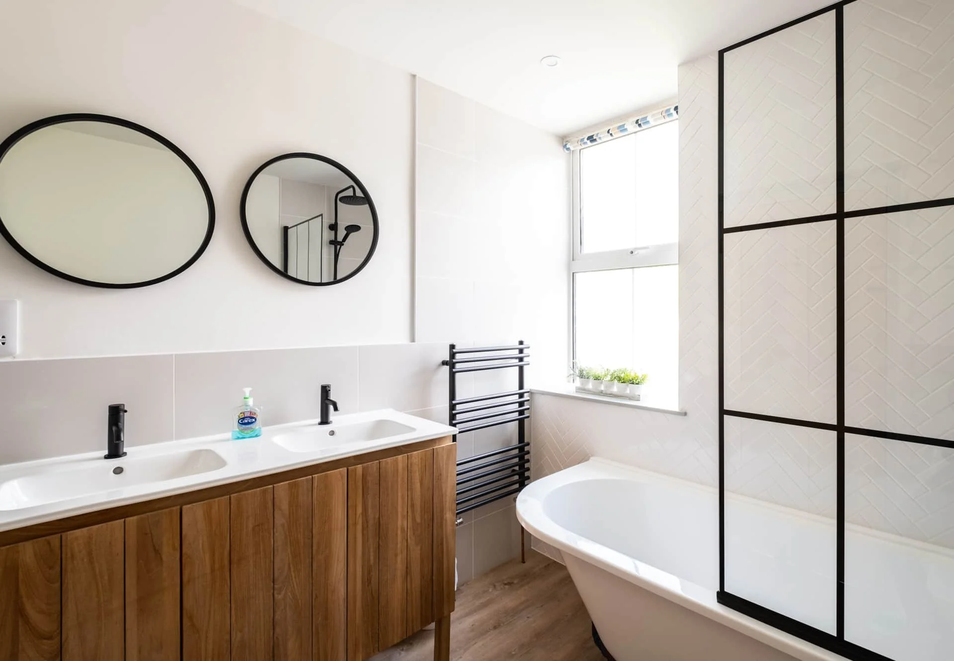 Bathroom with bath with shower over, heated towel rail, basin and WC